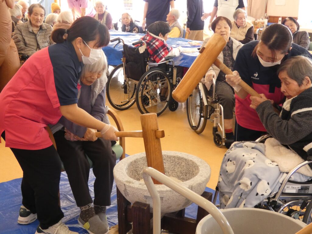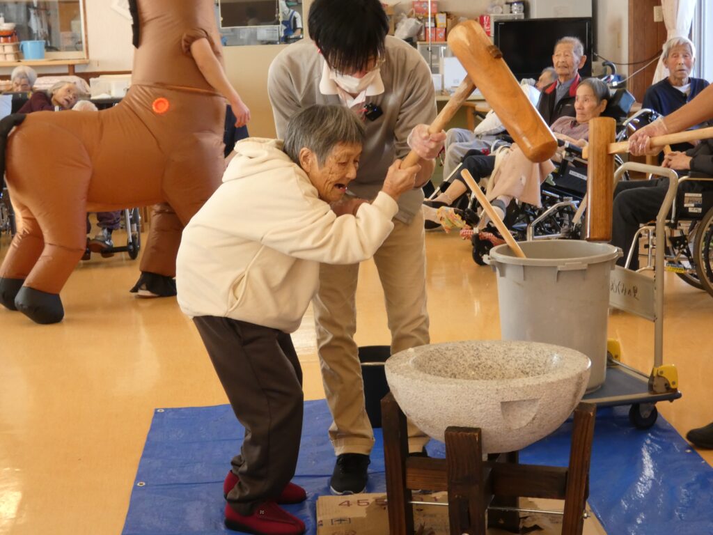「どら、かしてんない」と杵をとり、職員と一緒に餅をつく方もいらっしゃいました。