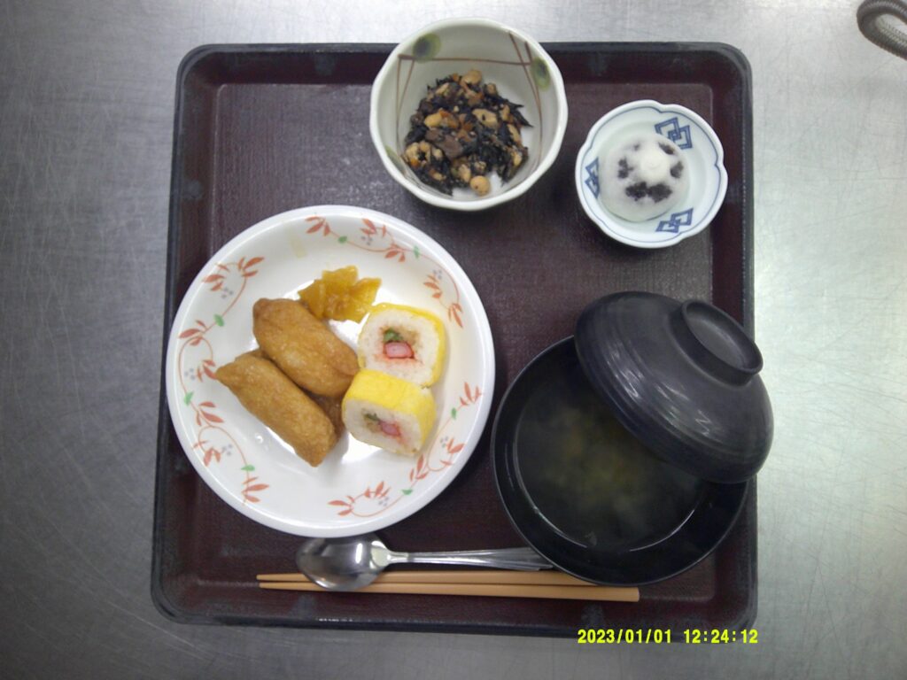 メニュー:巻寿司、稲荷寿司、大豆とひじきの煮物、つみれ汁、吹雪饅頭